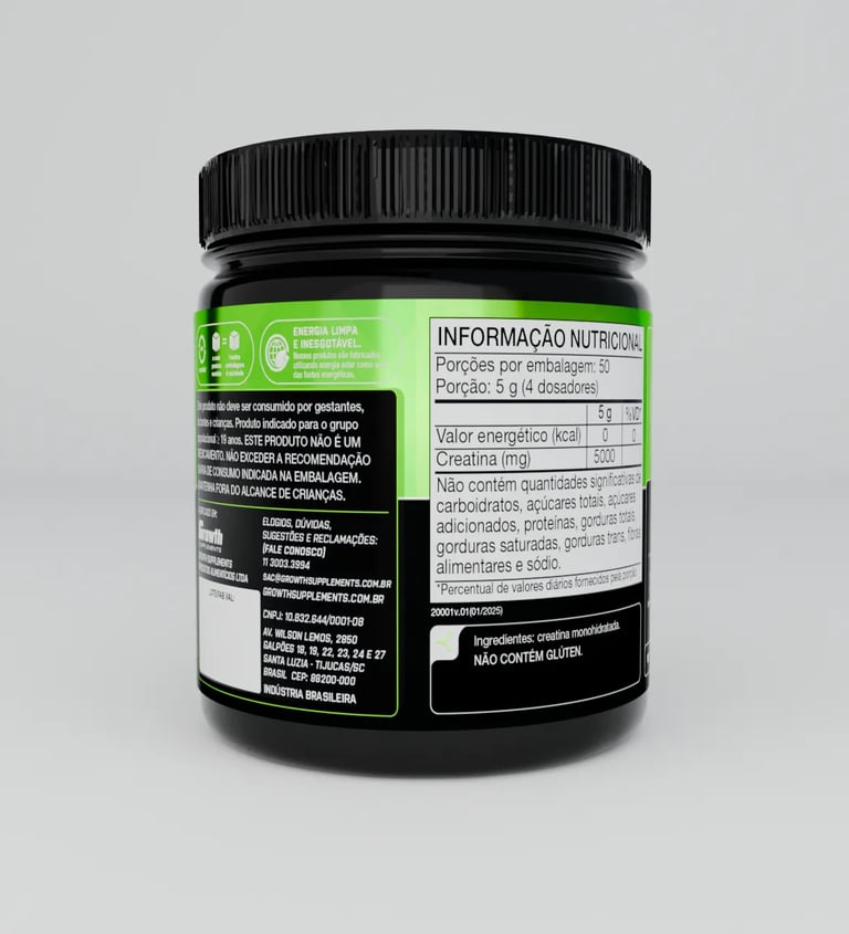 5g de creatina por porção 100% creatina monohidratada, sem aditivos e sem sabor Pode contribuir para a força, potência e a recuperação muscular Produto com foco em qualidade, com análise técnica e fabricação controlada Creatina Monohidratada Growth Supplements A creatina é um suplemento amplamente pesquisado na nutrição esportiva. É conhecida por seu papel potencial em apoiar a capacidade de gerar força, o que pode favorecer o desenvolvimento muscular e o rendimento em atividades físicas. Este produto utiliza matéria-prima selecionada e é submetido a verificações de qualidade.
